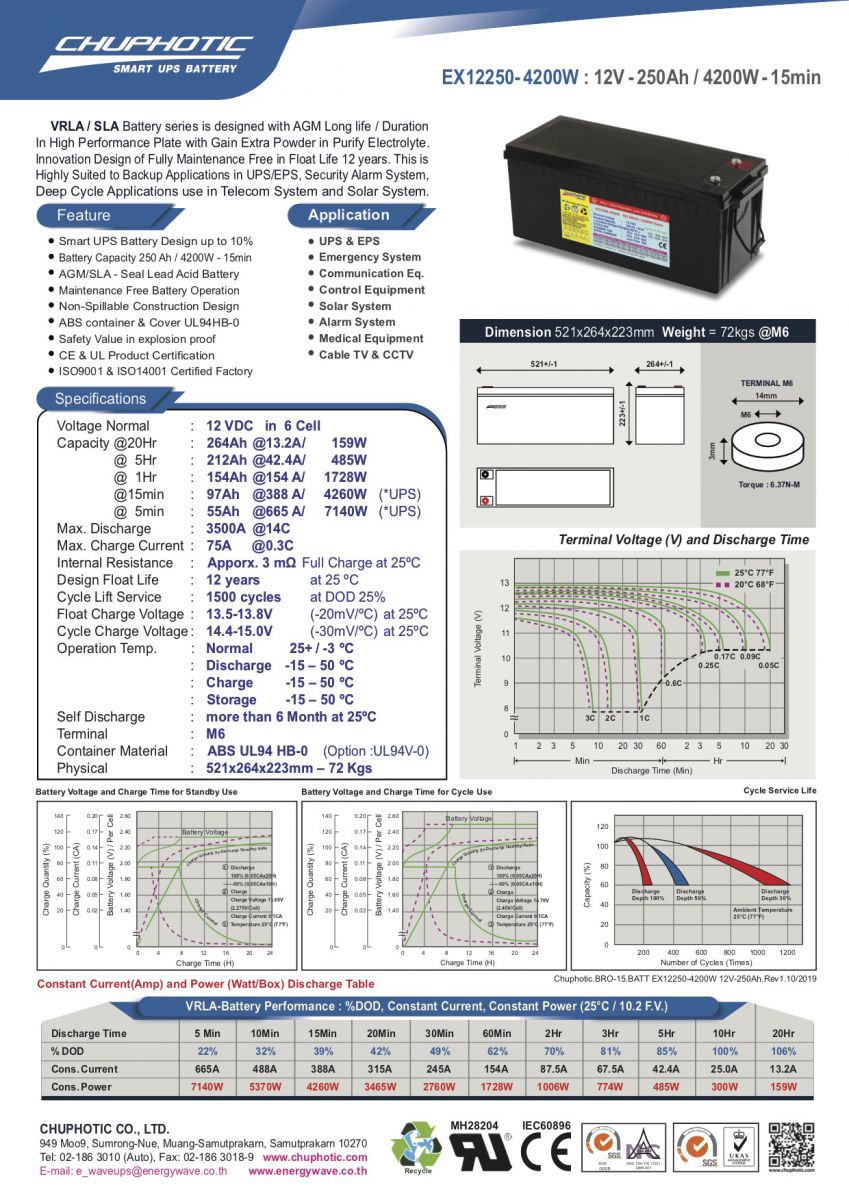 Smart UPS Battery Design up to 10% Battery Capacity 250 Ah / 4200W – 15min AGM/SLA – Seal Lead Acid Battery Maintenance Free Battery Operation Non-Spillable Construction Design ABS container & Cover UL94HB-0 Safety Value in explosion proof
